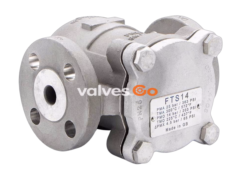 Spirax Sarco FTS14 is an austenitic stainless steel (316) ball float steam trap with an integral automatic air vent. It is available in sizes 1/2" to 1" (DN15-DN25) with flanged, screwed, or socket weld connections. Designed for PN25 conditions.